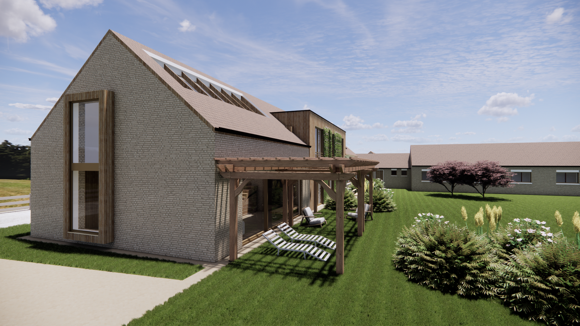 The architecture plays with both contrast and continuity. The existing structure is extended with simple and clear additions that respect the scale and rhythm of the farmhouse. Openings, covered outdoor spaces and vertical elements create a dynamic composition where inside and outside are closely connected.